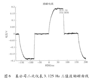 *先,采用某公司生產的二次儀表匹配一次儀表進行勵磁。該二次儀表采用在H橋低端設置恒流晶體管進行恒流控制的方法,其勵磁曲線結果如圖6所示,勵磁頻率為3.125Hz,勵磁方式為三值波勵磁,勵磁電流大約在51.16ms左右進入穩態,勵磁電流穩態段波動較大。
