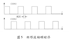 該電路主要由勵磁時序發(fā)生單元、三態(tài)緩沖器及隔離光耦組成。勵磁時序由冷凍鹽水流量計系統(tǒng)的控制核心產(chǎn)生。采用DSP的EPWM外設模塊,通過設定其內(nèi)部定時器的工作模式發(fā)出所要求的勵磁頻率的勵磁時序PWM信號CT_1和CT_2。由于勵磁控制系統(tǒng)中的勵磁工作電源的電壓要比DSP的工作電源電壓高得多,為防止勵磁電路故障對系統(tǒng)控制核心產(chǎn)生致命影響,采用光耦將控制部分與勵磁部分進行隔離。另外,由于DSP引腳的驅動能力有限,所以在DSP與隔離光耦之間加入三態(tài)緩沖器以驅動隔離光耦的輸入級。并且,DSP能夠通過GPIO口控制三態(tài)緩沖器上的使能引腳來使能和禁止勵磁,以在檢測到電路故障時迅速關斷H橋所有橋臂。該勵磁時序產(chǎn)生電路通過軟件編程可產(chǎn)生如圖5所示的單頻矩形波。在實際應用中,由于組成H橋的達林頓三極管與MOS管導通與關斷的時間不一致,易在勵磁方向切換瞬間,產(chǎn)生上下橋臂同時導通的現(xiàn)象,反映在勵磁電流波形上為一幅值很高的窄脈沖。該脈沖電流不僅容易引起遲滯比較電路的誤輸出,從而導致高低壓切換電路與電流旁路電路的誤動作,而且對恒流控制電路產(chǎn)生沖擊,減小三端穩(wěn)壓芯片的使用壽命,同時還會產(chǎn)生EMC電磁干擾,給測量精度帶來影響。所以實際應用時,如圖5所示對方波勵磁時序添加死區(qū),可以明顯減小上述現(xiàn)象。