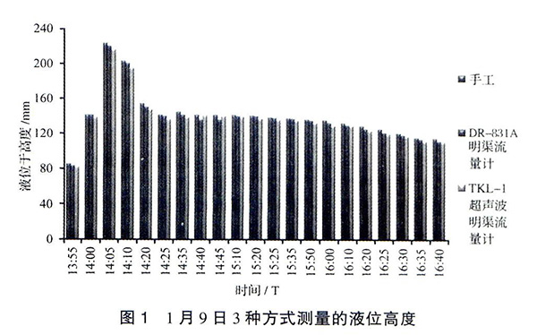 見(jiàn)圖3,以手工實(shí)測(cè)液位高度為基準(zhǔn),2種流量計(jì)的誤差均在±5%的范圍內(nèi)。除在1月9日14∶40和14∶45兩個(gè)時(shí)間點(diǎn)測(cè)量值表現(xiàn)出DR-831A測(cè)量誤差高于TKL-Ⅰ外,其他時(shí)段都明顯表現(xiàn)出DR-831A測(cè)量誤差小于TKL-Ⅰ。