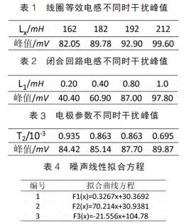 仿真試驗(yàn)中,設(shè)定線圈等效電感取值范圍為 162~212mH,間隔 10mH;閉合回路等效電感范圍 0.2~1mH,間隔為 0.2mH;雙電層電容、接觸電阻隨流體電導(dǎo)率變化而變化,電導(dǎo)率增大接觸電阻和雙電層電容減小而電荷傳遞電阻增大。可設(shè)定電極接觸電阻、雙電層電容和電荷傳遞電阻范圍分別為 5~15kΩ、10~20μF 和50~60Ω,由公式(7)知,可用 T2 表示上述三者關(guān)系。 仿真參數(shù)取值不同情況下,通過(guò) MATLAB 工具箱對(duì)仿真測(cè)量得到的干擾峰值進(jìn)行曲線擬合畫(huà)出相應(yīng)的曲線圖。 其中仿真數(shù)據(jù)和相對(duì)應(yīng)的曲線方程如表 1~表 4 所示,曲線圖如圖 4~圖 6。