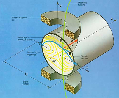 電磁流量計(jì)的工作原理是基于法拉*電磁感應(yīng)定律。在測(cè)量管內(nèi)的導(dǎo)電介質(zhì)相當(dāng)于法拉*試驗(yàn)中的導(dǎo)電金屬桿,上下兩端的兩個(gè)電磁線圈產(chǎn)生恒定磁場(chǎng)。當(dāng)有導(dǎo)電介質(zhì)流過(guò)時(shí),則會(huì)產(chǎn)生感應(yīng)電壓。管道內(nèi)部的兩個(gè)電極測(cè)量產(chǎn)生的感應(yīng)電壓。