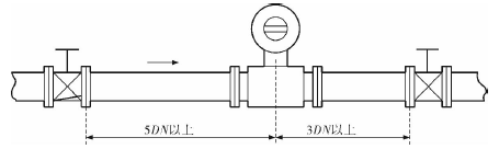 工業(yè)鹽水流量計的安裝質(zhì)量對其測量結(jié)果的影響較大,因此在安裝時需要注意幾個問題。*先,工業(yè)鹽水流量計直管段的選擇在配管時一定要按照要求進(jìn)行選擇,一般選擇流量計通徑與工藝管道通徑相同,即可滿足工程需要,而且安裝方便、壓力損失小,流量計直管段上游側(cè)的長度不少于5倍工藝管道直徑,下游側(cè)的長度不少于3倍工藝管道直徑(圖2)。但在流速太慢而又要求精度較高或需要變徑的應(yīng)用場合,可選擇通徑小于工藝管道通徑的流量計,以提高測量精度,此時流量計上、下游必須加裝異徑管,且進(jìn)口異徑管上游側(cè)應(yīng)有長于10倍工藝管道直徑的直管段,下游側(cè)應(yīng)有長于5倍工藝管道直徑的直管段(圖3)。