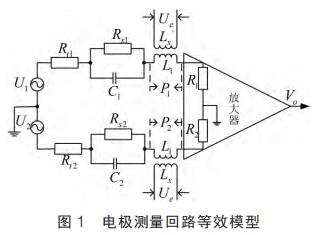 提出在硬件電路上加入模擬開關(guān), 干擾尖峰到來時(shí)斷開模擬開關(guān)避免干擾進(jìn)入后級電路,尖峰過去重新打開模擬開關(guān);K.Saito 等提出漂移校正法,先以高勵磁頻率進(jìn)行勵磁,在勵磁過程中插入低勵磁頻率提取用于漂移校正的非固定微分噪聲分量,但在插入的低勵磁頻率段漿液噪聲較大且很難將漿液噪聲與流量信號分離,此時(shí)的校正因子非單純的非固定噪聲分量,改進(jìn)措施是長時(shí)間取平均值得到穩(wěn)定因子。 傳統(tǒng)方法是同步采樣保持法,即在磁場穩(wěn)定階段采樣。 其他消除干擾的方法有設(shè)置干擾補(bǔ)償機(jī)構(gòu)、控制勵磁電流變化率減小干擾幅值、矩形波代替梯形波、希爾伯特黃變換結(jié)合傅里葉變換和程控增益技術(shù)等。經(jīng)上述對現(xiàn)有的文獻(xiàn)分析與總結(jié)可知, 當(dāng)前消除微分噪聲主要從信號處理方面入手,并未對影響噪聲的因素加以研究。 本文建立電極測量回路等效模型,給出仿真模型搭建、參數(shù)取值和仿真結(jié)果分析。