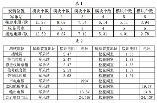 接地網(wǎng)的安裝與連接:接地網(wǎng)是整個(gè)重油流量計(jì)防雷試驗(yàn)比較關(guān)鍵的一個(gè)內(nèi)容,能不能準(zhǔn)確的論證試驗(yàn)的有效性,必須保證接地網(wǎng)達(dá)到標(biāo)準(zhǔn)的接地電阻,通過(guò)對(duì)實(shí)地地電阻率的測(cè)試,初步選擇6個(gè)接地模塊埋設(shè)并配用降阻劑使用,邊安裝邊測(cè)試直到達(dá)到標(biāo)準(zhǔn)值后才引入等電位箱。在軍樂(lè)站和松花閥室安裝模塊并測(cè)試數(shù)據(jù)見表1。