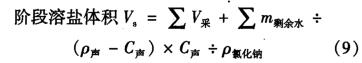 式中:V,為日溶鹽體積,m3; VA為日采鹽體積,m3 ;場余為腔體擴大后未排出液體的溶鹽體積,m3 ; Vip1*a為腔體擴大后未排出液體體積,m3m剩赫為腔體擴大后未排出的液體中等效淡水溶劑質量,kg;V排-為日排出液體體積,m3m瑰為日注人液體體積,m3; C排為日排出液體氯化鈉質量體積濃度,歲1; C排-為日注人液體氯化鈉質量體積濃度,g/l;C注為日排出液體密度,kg/m3 ; p注為日注人液體密度,kg/m3,P氯化鈉為氯化鈉密度,kg/m3 ; p水為水的密度,kg/m3 ; V8為階段溶鹽體積,m3 ; C聲為聲吶測量時腔體內氯化鈉質量體積濃度,g/1; P聲為聲吶測量時腔體內液體密度,kg/m3kg/M。