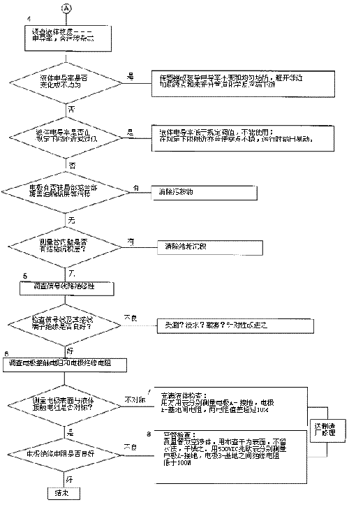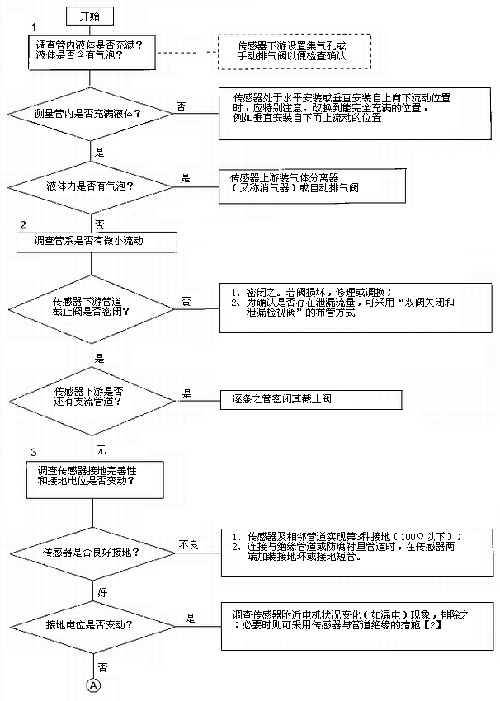 檢查流程圖*5項。信號回路絕緣下降會形成零點不穩(wěn)。信號回路絕緣下降的土要原因足,包極部位絕緣下降所引起的,但也不能排除信號電纜及其接線端子絕緣下降或破壞。因為有時候現(xiàn)場環(huán)境十分嚴酷,稍一疏忽儀表蓋、導線連接處密封不慎,彌漫著潮氣酸霧或粉粒塵埃侵入儀表接線盒或電纜保護層,使絕緣卜降。信號回路絕緣電阻檢查分別按電纜側和流量傳感器側兩郵分進行,用兆歐表測試。因信號電纜容易可先做。流量傳感器再分兩次進行:充滿液體測黽電極表面接觸電阻和個管后測量,U極絕緣電阻。