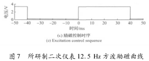 *先,采用某公司生產的二次儀表匹配一次儀表進行勵磁。該二次儀表采用在H橋低端設置恒流晶體管進行恒流控制的方法,其勵磁曲線結果如圖6所示,勵磁頻率為3.125Hz,勵磁方式為三值波勵磁,勵磁電流大約在51.16ms左右進入穩態,勵磁電流穩態段波動較大。