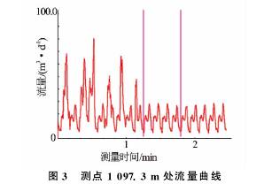 T-××-××1井是大慶油田采油五廠1口水驅(qū)產(chǎn)出井,采用阻抗式含水率計在該井進行了測試。圖3、圖4分別為測點深度1097.3m測量的流量及混相值曲線圖。2min的采樣時間內(nèi),流量及混相值曲線波動劇烈,明顯受井下產(chǎn)氣影響,進行平均值計算時只能取后半段較平穩(wěn)的數(shù)據(jù),因此,測試時需延長測量時間。錄取不同范圍數(shù)值時流量及含水率測量差值較大,流量平穩(wěn)段為14.81m3/d,高值時達到23.52m3/d;取不同測量段的混相值時測量含水率*大相差12%。重復測量得到了相同的測量結果。由此可見,氣體對流量及含水率測量產(chǎn)生了非常大的測量誤差。