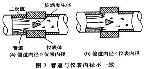 而丙烷流量計(jì)與安裝管道內(nèi)徑也會(huì)存在誤差,或大或小,如圖3所示,當(dāng)被測(cè)介質(zhì)經(jīng)過(guò)時(shí),也會(huì)發(fā)生二次流動(dòng),對(duì)測(cè)量結(jié)果產(chǎn)生波動(dòng)影響。