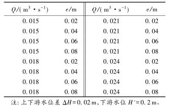 有限水域的浮體結構在不同來流動水中運行時,浮體結構位置的改變會對流場產生影響,從而影響浮體結構的泄流能力以及穩定性。試驗過程中固定浮體結構的體型不變(長L=0.20m,寬B=0.30m,高a=0.10m),分別選取4種不同來流流量Q及浮體結構位置e,控制浮體結構在上、下游水位不變的條件下進行試驗,具體試驗參數設計及說明見表1以及圖2。