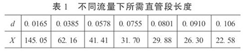 3.直管段長(zhǎng)度和硅油流量計(jì)精度的初步預(yù)測(cè)在工程設(shè)計(jì)中,根據(jù)流體性質(zhì)、流量和雷諾數(shù)確定α和d值。這樣,按照式(5)就可以依不同的流量計(jì)精度要求,對(duì)直管段長(zhǎng)度進(jìn)行初步預(yù)測(cè),或確定直管段長(zhǎng)度后,對(duì)流量計(jì)的精度做初步預(yù)測(cè)。當(dāng)δ= 0.2%時(shí),不同流量下所需直管段長(zhǎng)度見表1。