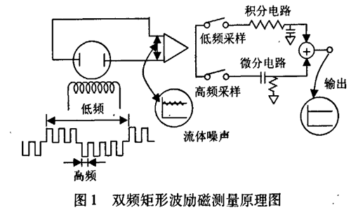 雙頻矩形波勵磁測量原理如圖l所示,一個由高低頻分量迭加而成的電磁場通過勵磁線圈被施加到被測液體中,勵磁波形是在一個低頻矩形波上迭加一個高于市電頻率的矩形波而得到的波形。在產(chǎn)生的電動勢中,低頻分量通過一個大時間常數(shù)的積分電路獲得一個零點穩(wěn)定性好的平穩(wěn)流量信號。而由漿液或低電導(dǎo)率流體產(chǎn)生的低頻噪聲可被不受噪聲影響的高頻采樣電路所抑制,有著同樣時間常數(shù)的流量信號經(jīng)過一個差分電路以確定流速信號的變化,把這兩種不同頻率采樣所得的信號結(jié)合起來可獲得一個穩(wěn)定流速信號,該信號不受噪聲干擾,且有較高的零點穩(wěn)定性。
