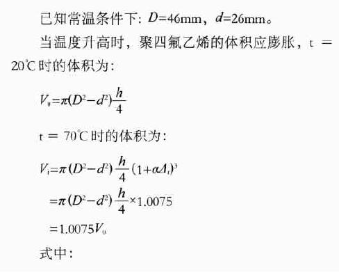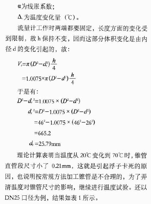 為了保持聚四氟乙烯零件尺寸的穩(wěn)定性,規(guī)定其溫度應(yīng)用范圍是70℃以下。在試制的初始階段,用常規(guī)加工方法,即按圖紙尺寸進行錐管和浮子的加工,可以發(fā)現(xiàn),在常溫下工作正常的浮子在高溫試驗中出現(xiàn)了卡死現(xiàn)象,反復(fù)的試驗都得到同樣的結(jié)果。實際測量表明:浮子尺寸變化不大,因此推斷是由于錐管尺寸的變化引起卡死現(xiàn)象。通過理論計算,得出結(jié)論,以利改進。
