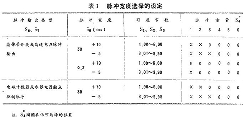 脈沖重量設定用S4插頭選擇進行,它的設定有一定的條件,這些條件是脈沖輸出的類型、脈沖寬度和刻定常數。并且它的選擇范圍還要依據脈沖寬度和*大測量流量-口-口口-l0的X方(m3/h)來確定。其系數-(數字同*大流量m3/h)由*大流量的前三位有效數定決定,而對應于“x”值的脈沖重量(l/p)見表2。