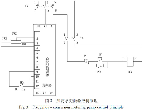 STD - Ⅲ型浮選工藝參數(shù)自動測控系統(tǒng)通過雙膜盒差壓計測量原礦漿濃度; 采用插入式電磁流量計測量原礦漿流量,由 PLC 計算出入浮干煤泥量和藥劑的瞬時添加量,用變頻式計量泵完成浮選藥劑的添加。通過上位機(jī)還可以打印小時、班、天及月的運(yùn)行數(shù)據(jù),更加有利于生產(chǎn)管理及技術(shù)分析,藥劑自動原理如圖 2 所示,k1、k2、k3 是計算修正參數(shù)。以 PID 算法為核心,通過優(yōu)化控制程序計算出藥劑給定量,在捕收劑和起泡劑管道上分別安裝藥劑測量裝置,用于檢測藥劑的添加量。當(dāng)藥劑測量值小于藥劑給定量時,PID 輸出增大,反之則減小。加藥泵變頻器控制原理如圖 3 所示。