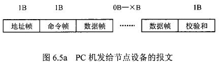在飲用水流量計等節(jié)點設(shè)備和C機通信的過程中,由地址幀、命令幀、數(shù)據(jù)幀、校驗和可組成各種功能不同的報文。由于采用主從工作方式來實現(xiàn)通信,飲用水流量計等節(jié)點設(shè)備僅能接收并執(zhí)行PC機發(fā)送來的控制命令,而不能發(fā)送命令給PC機。因此,由PC機發(fā)往流量計等節(jié)點設(shè)備的報文一般包括一個地址幀,一個命令幀,若干個數(shù)據(jù)幀和一個校驗和,其報文格式圖.6a5所示;而由流量計等節(jié)點設(shè)備發(fā)往PC機的報文一般包括一個地址幀,若干個數(shù)據(jù)幀和一個校驗和,其報文格式如圖6.5b所示。