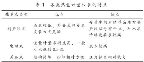 目前供熱行業內使用的熱量計量儀表按工作原理主要分為超聲波式、 電磁式、 差壓式, 其特點見表 1 。 熱量計量儀表按結構可分為一體式和分體式, 一體式熱量表將一支入口或出口溫度傳感器嵌入到流量傳感器管道中, 并配有專門的計算器進行熱量計算; 分體式熱量表采用單獨的流量傳感器, 包括超聲波流量計、 電磁流量計、 差壓流量計、飽和鹽水流量計等, 溫度測量采用單獨的鉑電阻溫度計或溫度變送器測量供回水管道溫度, 再配備熱量積算儀進行溫度和流量信號采集得到熱量值。