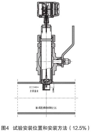 根據(jù)中華人民共和國機(jī)械行業(yè)標(biāo)準(zhǔn):JB/T9249-2015《壓縮空氣流量計》進(jìn)行插入式壓縮空氣流量計的研制與設(shè)計。在試驗過程中,因為理論研究不充分,再加上經(jīng)驗不足,采用插入深度是按照以往其它產(chǎn)品(插入式電磁流量計)的經(jīng)驗,以插入深度為現(xiàn)場管道內(nèi)徑的 12.5% 進(jìn)行試驗,其對介質(zhì)流量的檢測值與同種規(guī)格管道法蘭式結(jié)構(gòu)的壓縮空氣流量計進(jìn)行比較,偏差值較大、儀表準(zhǔn)確度無法滿足設(shè)計要求。試驗安裝位置和安裝方法如圖 4 所示。