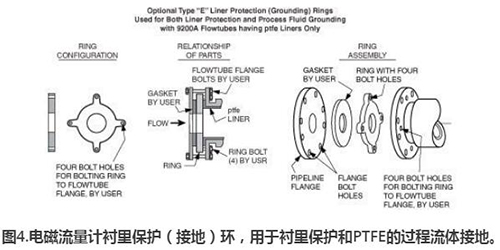 法蘭式流量管:當法蘭式流量管安裝在非金屬,塑料,PVC或襯里的工藝管道之間時,SG必須通過除工藝管道法蘭螺栓之外的其他路徑。在這種安裝方案中,需要接地環或接地電極(圖6)。