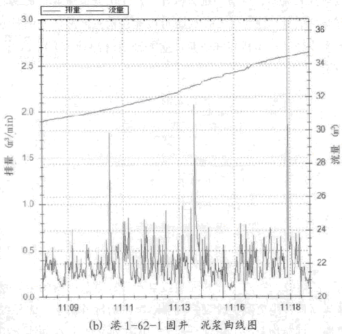 在固井全程的曲線中,也可以發(fā)現(xiàn)開始固井的時候.泥漿排量雜波較小,究其原因是剛開始固并時,泥漿管線剛泄壓,管線中還是充滿了液體,雖然振動強(qiáng)度雷同.但是葉片有阻尼,振幅較小.對其影響也較小。例如曲線圖的11;03: 00-11: 03: 53之間的泥漿排量沒有雜波。在港1-62-1固井過程中,水泥漿打了413澎,結(jié)果本應(yīng)該是0的泥漿,卻走數(shù)了23.0 m',其影響可謂巨大.并非通過普通的濾波或切除所能排除,必須執(zhí)行一個特殊算法。