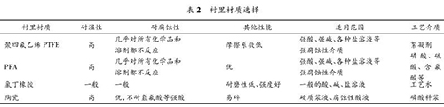 液體流量計要根據被測流體的溫度、壓力、速度以及含固顆粒的硬度、含量和粒徑大小來決定測量管內襯的材質。該濕法磷酸裝置中,液體流量計測量管襯里材質的種類見表 2。