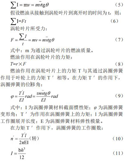 假設(shè)渦輪固定不動(dòng),燃油流過渦輪的葉片時(shí)將受到阻力,則當(dāng)燃油離開渦輪的葉片時(shí),將產(chǎn)生一個(gè)切向動(dòng)量 mv,這個(gè)動(dòng)量即為渦輪獲得沖量 。