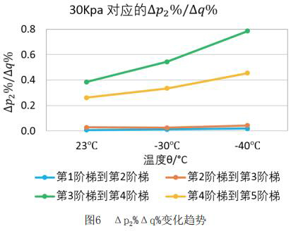 為了更直觀嚴謹的對比每個階段響應速度的不同,對原始數據進行處理,得到如下表格2和表格3。將△p2%/△q%作為響應速度的直觀量化表達,若△p2%/△q%的值大,說明單位流量變化照成的出口壓力變化大,即說明電磁流量計響應相對較慢,反之亦然。