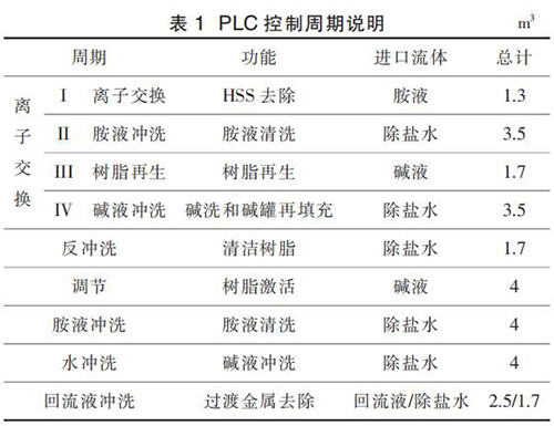 APU 的運行按照事先設定的程序運行,即嚴格遵循設定的步驟順序。 APU 的正確運行依賴于每個步驟的順利完成。 按照預先設定好的步驟完成 1 個任務即視為完成 1 個 APU 運行的“周期”。 離子交換的主周期被稱為“離子交換周期”。除此之外,整個控制程序還包含另外 5 個輔助周期, 分別為反沖洗周期、調節(jié)周期、胺液沖洗周期、水沖洗周期、回流液沖洗周期。 這 5 個周期在維護和非計劃停車后重新啟動時使用。 PLC 控制各個周期的說明見表 1。
