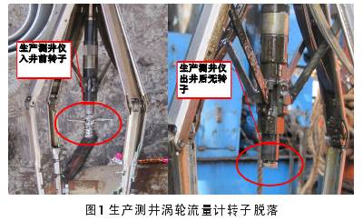 測井儀底部氣體渦輪流量計在四上四下測井任務中轉速過快,地面直讀顯示該轉子的*高轉速達到260rps,超過了轉子的安全工作轉速.上限200rps,同時需長時間滯留在產層位置進行流壓測試操作,因此直接原因為轉子在高溫高流速的極限工作環境下發生脫落,影響了測井數據的錄取,如圖1所示。