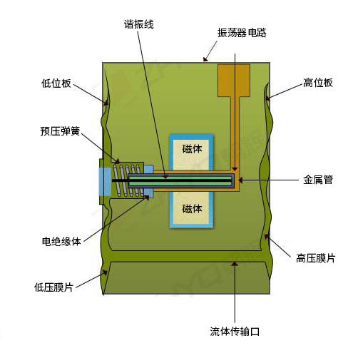 由磁場驅(qū)動(dòng)的振蕩器電路會(huì)導(dǎo)致導(dǎo)線以其共振頻率振蕩。導(dǎo)線的一側(cè)牢固地固定到靜態(tài)部件,而另一側(cè)則連接到膜片。彈簧使電線預(yù)緊。由于過程壓力對(duì)隔膜的影響,金屬絲將在壓力升高時(shí)拉伸,而在壓力降低時(shí)收縮。共振頻率將相應(yīng)地增加或減少。數(shù)字計(jì)數(shù)器測量諧振頻率的變化,并將其信號(hào)傳遞給微芯片,該微芯片還處理線性化補(bǔ)償和溫度補(bǔ)償。