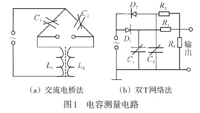 差壓液位變送器的測量電路如圖1所示,變送器的輸出可以轉(zhuǎn)換成電壓、電流或頻率等信號,然后放大。圖1(a)的交流電橋法是將兩個(gè)電容器接于交流電橋的兩個(gè)相鄰臂上,交流電橋的輸出經(jīng)放大與相敏檢波后進(jìn)行測量。圖1(b)的雙T網(wǎng)絡(luò)法壓差引起的電容變化轉(zhuǎn)換成電壓變化輸出。在交流電源正半周時(shí),通過二極管D1對電流器C1進(jìn)行充電,在負(fù)半周時(shí),電容器C1經(jīng)電阻R1與R3進(jìn)行對地放電;而電容器C2 則在電源的負(fù)半周充電、正半周對R3 與R2 反向放電。因此R3上兩端的電壓輸出是由C1與C2的平均放電電流之差所決定的。當(dāng)壓差為零時(shí),C1、D1、R1與C2、D2、R2的參數(shù)相同,則通過R3的平均放電電流之差為零。當(dāng)壓差不等于零時(shí),差動電容C1與C2一個(gè)增大一個(gè)減小,使兩者的平均放電電流不相等,因此R3兩端的電壓輸出也就有了相應(yīng)的變化。