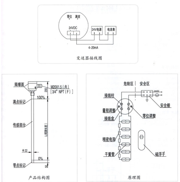磁浮球液位計由液位傳感器和電流轉換器兩部分組成,浮球與液位同步變化,控制彈簧管吸合斷開,從而使傳感器內電阻成線性變化,再由轉換器將電阻的變化轉換成4~20mA標準電流信號并疊加數字信號輸出。能對開口、密閉容器或地下池槽里的介質液位在儀表控制室內進行顯示、報警和控制。