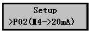 1)在分體式超聲波液位計(jì)正常工作時(shí)按擊Mode鍵進(jìn)入?yún)?shù)設(shè)置菜單后按擊▼鍵選擇P02(4~20mA)設(shè)置菜單,如右圖。