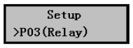 1) 在分體式超聲波液位計(jì)正常工作時(shí)按擊Mode鍵進(jìn)入?yún)?shù)設(shè)置菜單后按擊▼鍵選擇到P03(Relay)繼電器設(shè)置菜單,如右圖所示。