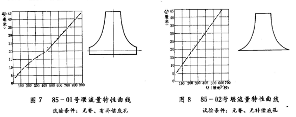 用85-01號和85-02號兩種雙曲線薄壁堰,在試驗水槽端安裝成無脊有補償孔和無補償孔兩種情況,進行了多次實驗,所得數據通過整理,畫出流量特性曲線,見圖7和圖8。