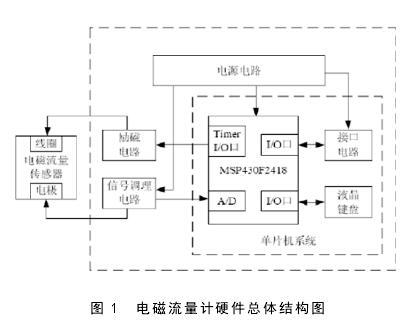新型固井電磁泥漿流量計(jì)的硬件部分是由電源電路、傳感器、信號采集處理電路、勵(lì)磁電路以及接口電路共同組成。如圖 1 所示,為電磁流量計(jì)硬件總體結(jié)構(gòu)。