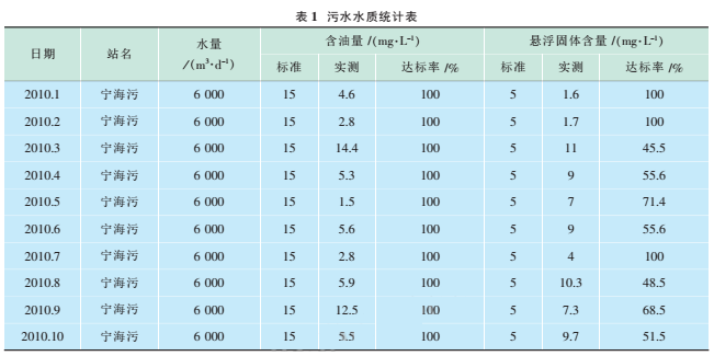 以一礦為例,2010年1~10月寧海污水站累計(jì)處理污水187萬(wàn)m,日均6200m。,110月份外輸污水含油累計(jì)達(dá)標(biāo)率100%,外輸懸浮物累計(jì)達(dá)標(biāo)率69.7%(見(jiàn)表1)。