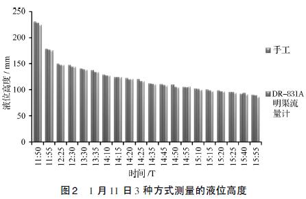 見圖3,以手工實測液位高度為基準,2種流量計的誤差均在±5%的范圍內。除在1月9日14:40和14:45兩個時間點測量值表現出DR-831A測量誤差高于TKL-Ⅰ外,其他時段都明顯表現出DR-831A測量誤差小于TKL-Ⅰ。