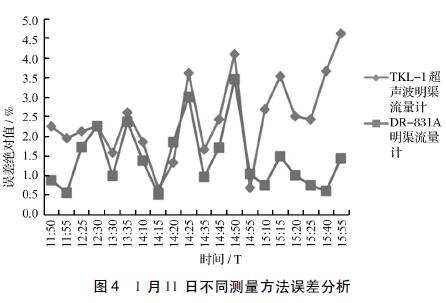 由圖4可知,以手工實測液位高度為基準,2種流量計的誤差均在±5%的范圍內。1月11日12:30~14:55期間,DR-831A和TKL-Ⅰ測量誤差比較接近。其他時段,2者呈現出前者測量誤差要小于后者測量誤差。