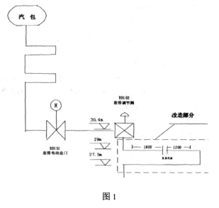 異形孔板安裝在鍋爐30米處連排管段,截去一段加裝U形管段的來流直管段上,根據安裝要求,測點位置選在距離上游直管段1810mm,距離下游直管段1085mm處。符合“距離上游直管段>10D(D=56mm,管道內徑),距離下游直管段>5D”的要求。孔板的取壓管為垂直向下,圓缺孔板的弦與管道橫截面水平中心線平行安裝。其改造安裝圖如圖1所示。
